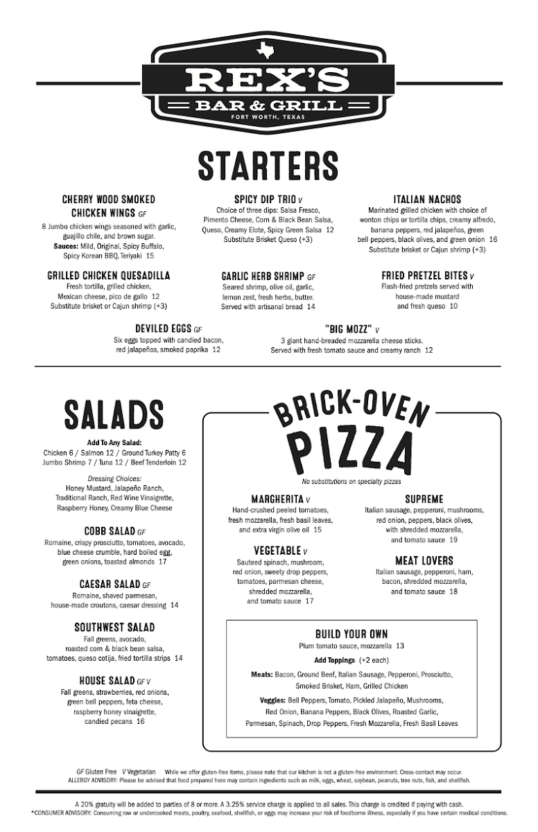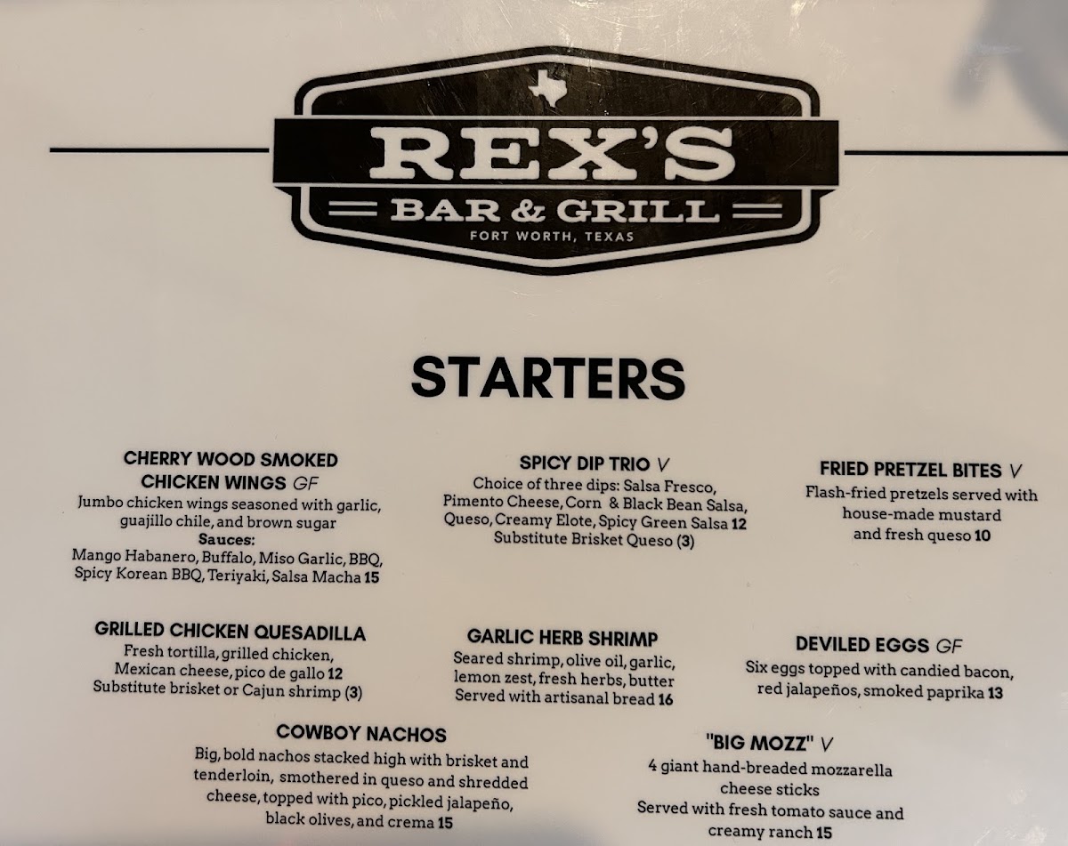 Rex's Bar & Grill offers a diverse and delicious menu that caters to a wide range of tastes and preferences. Starting with Starters, guests can indulge in favorites like Cherry Wood Smoked Chicken Wings and Fried Pretzel Bites, both perfect for sharing or kicking off a meal. If you're in the mood for something savory, the Cowboy Nachos or Garlic Herb Shrimp might be just what you need. The Deviled Eggs offer a classic touch, while the Garlic Herb Shrimp brings a burst of flavor to begin your dining experience.