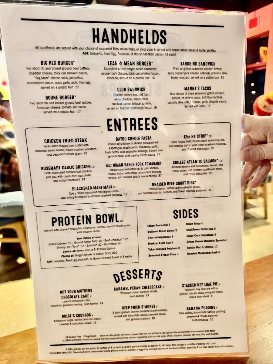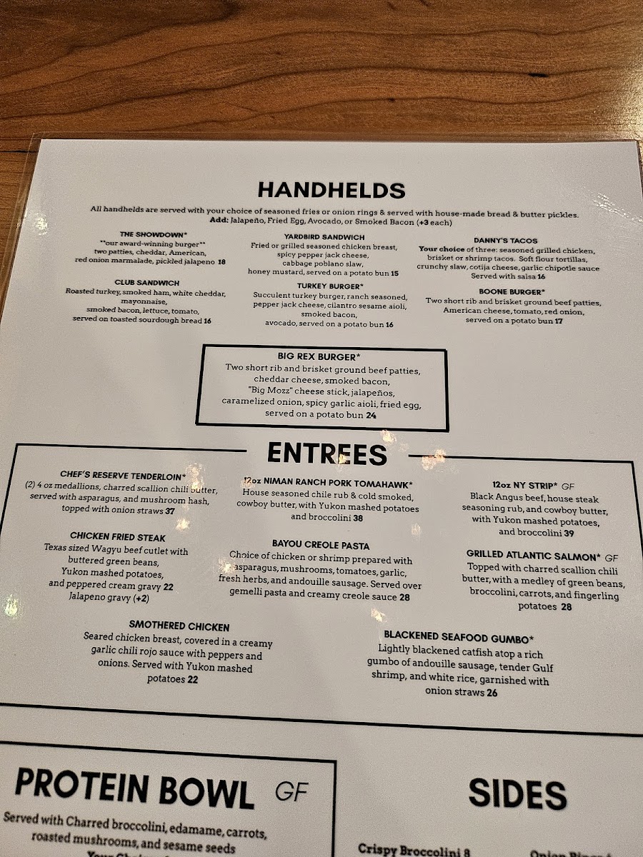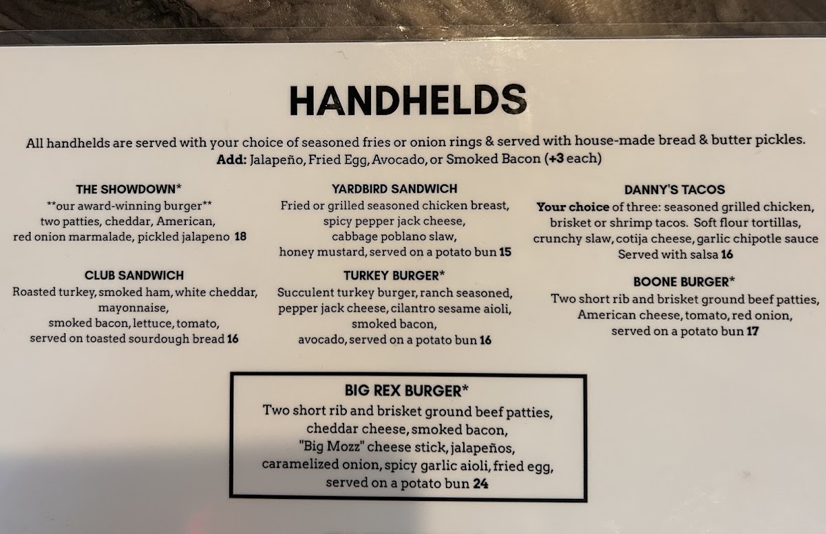 The Handhelds section is perfect for those on the go or looking for something hearty. Whether you're in the mood for a juicy Showdown Burger or the Big Rex's Burger, these choices are sure to satisfy. The Yardbird Sandwich and Danny's Tacos offer a delicious variety for those who prefer a different flavor, while the Turkey Burger provides a lighter option.
