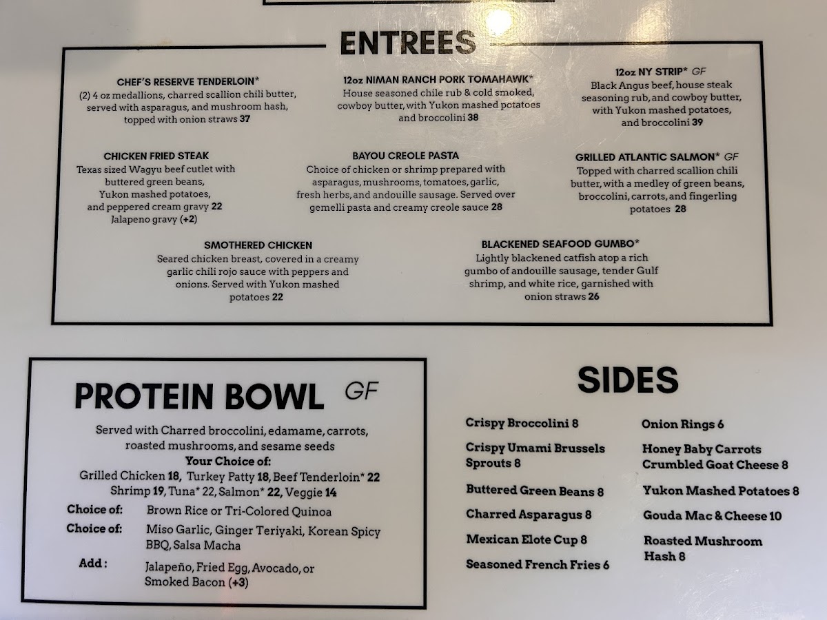 Main courses, or Entrées, offer a selection of mouthwatering dishes like the Chef's Reserve Beef Tenderloin, Smothered Chicken, and Chicken Fried Steak, each cooked to perfection. Seafood lovers will enjoy the Grilled Atlantic Salmon and Blackened Seafood Gumbo, bringing the tastes of the ocean right to your table.